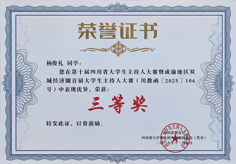 作为川渝地区播音与主持领域的重磅赛事,本届大赛汇聚了全国87所本专科高校的5198名学子同台比拼。比赛内容分为自备主持、即兴评述2个环节,全面考察选手的语言表达能力、逻辑思维、临场应变及综合素质。大赛复赛共有三大主题赛道,全方位检验选手综合素养,参赛同学结合自身优势,均衡分布于各赛道,构建起全面覆盖的参赛格局,充分体现多元发展的特点。凭借专业素养及对语言艺术的赤诚热爱,杨俊礼沉稳从容、灵活应变,在众多优秀选手中脱颖而出,最终斩获大赛三等奖。