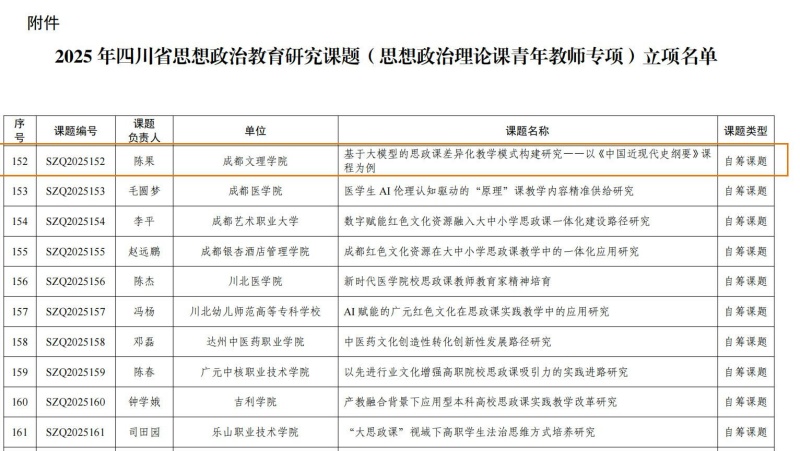 11月18日,四川省教育厅正式公布了2025年四川省思想政治教育研究课题(思想政治理论课青年教师专项)立项名单。马克思主义学院陈果老师申报的课题《基于大模型的思政课差异化教学模式构建研究——以《中国近现代史纲要》课程为例》经过激烈角逐,成功获得立项。这一成果标志着学院在青年教师培养和科研创新方面取得了又一重要进展。