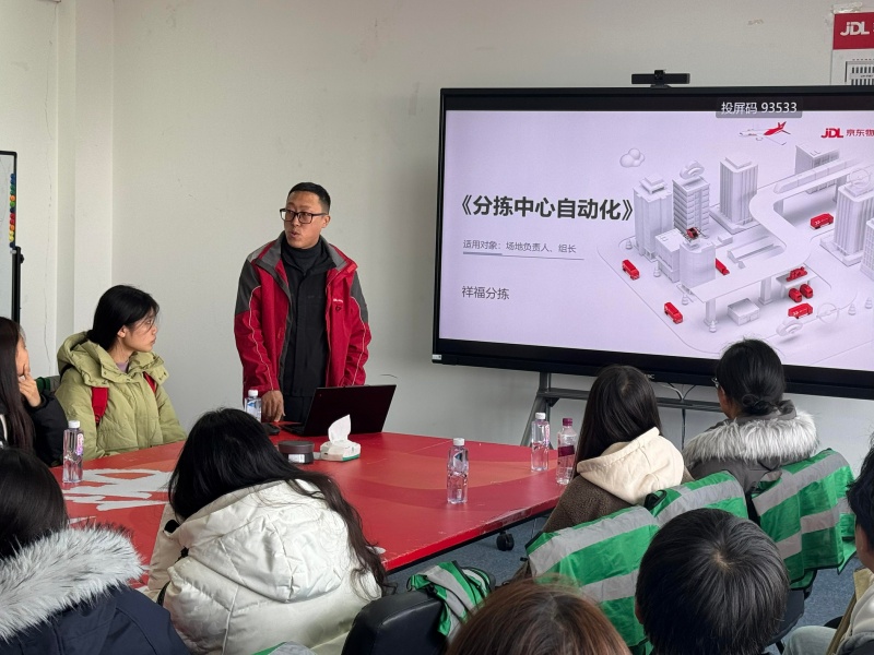 首先,同学们进入京东物流成都枢纽的培训中心,京东安排了具有丰富工作经验的企业导师李亮经理为同学们做《分拣中心自动化》的专题讲座。李经理简要介绍了分拣中心从人工到自动化、智能化的技术发展迭代历程;然后以图文与视频方式结合,生动详细的介绍了快递从接车、卸载、拆包、上线、分拣、打包、装载、发运的流程以及大件、小件、非标件自动分拣机的工作原理;最后以日报、周报、月报案例数据可视化展现方式讲解了如何通过数据监控和优化物流管理。他特别强调,在自动化物流体系中,海量数据的采集、分析与决策已成为驱动效率提升的核心引擎,这正是“大数据管理与应用”专业价值的现实体现。这场讲座用企业日常运营中的真实案例,让同学们对智慧物流的发展有了初步的理论认知,也深刻体会到,精准的数据分析能力是优化现代供应链管理的基石。