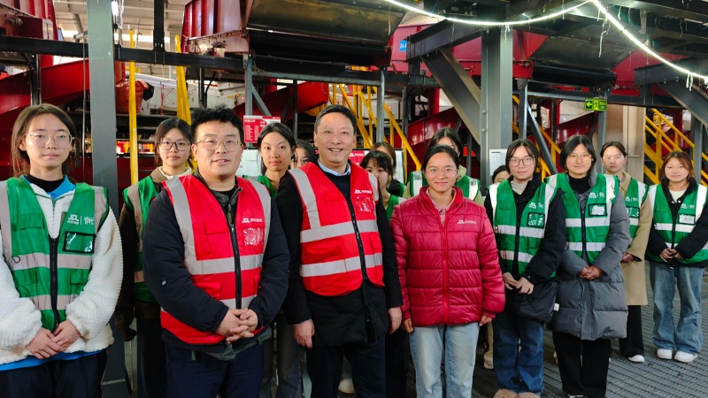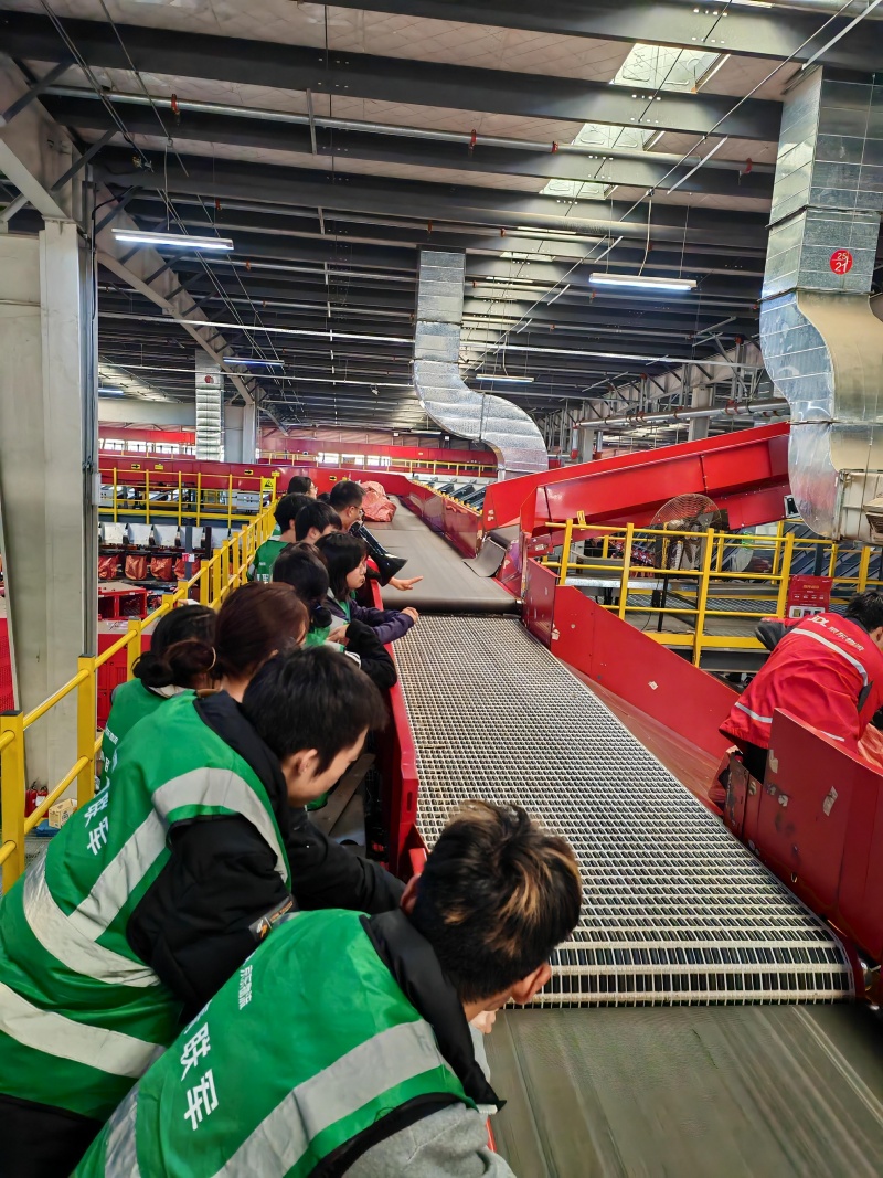 随后,在京东物流西南区用工保障部人力资源总监李莉的带领下,同学们分两组有序进入园区核心作业区进行实地参观。在我国自动化程度最高的分拣系统和日处理能力最强的分拣中心,大家零距离接触了物流枢纽的高科技“硬核”装备:高效运转的交叉带分拣机如同精密的城市轨道,将包裹精准投入指定格口;自动化称重测体积(DWS)系统与输送机网络无缝衔接,实现了包裹信息的瞬时采集与高效流转;在仓储区,高层货架与各类装卸设备的协同运作,展示了现代物流对空间与时间的极致利用。此前在讲座中听到的自动化概念,此刻化作了眼前震撼的运转实景,使同学们对智慧物流的运转流程有了更深刻、更直观的理解。