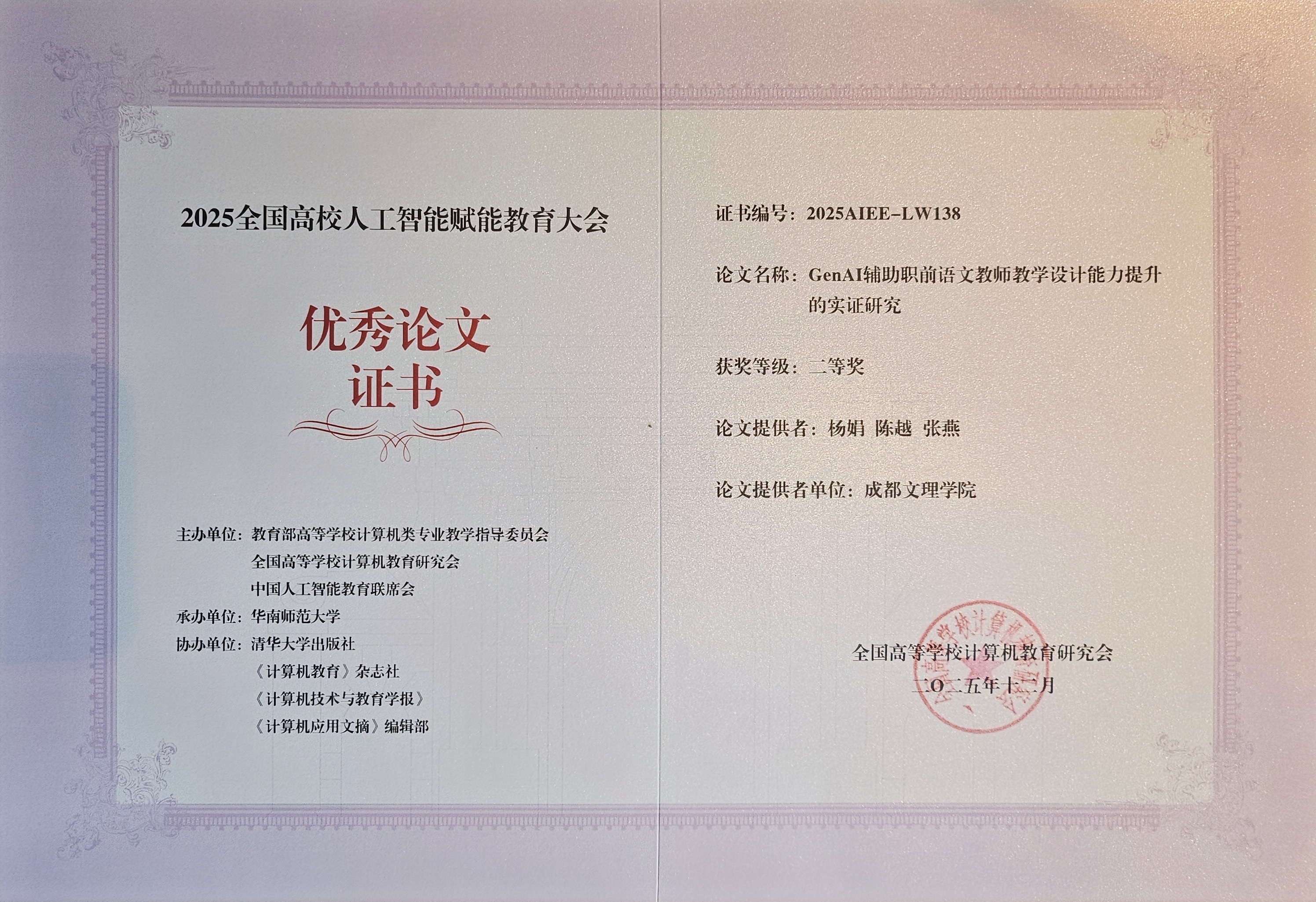 此外,杨娟、陈越、张燕三位教师合作撰写的论文《GenAI辅助职前语文教师教学设计能力提升的实证研究》同时获评大会论文二等奖,杨娟老师作为代表进行了精彩的案例宣讲,得到了与会专家学者的高度评价。