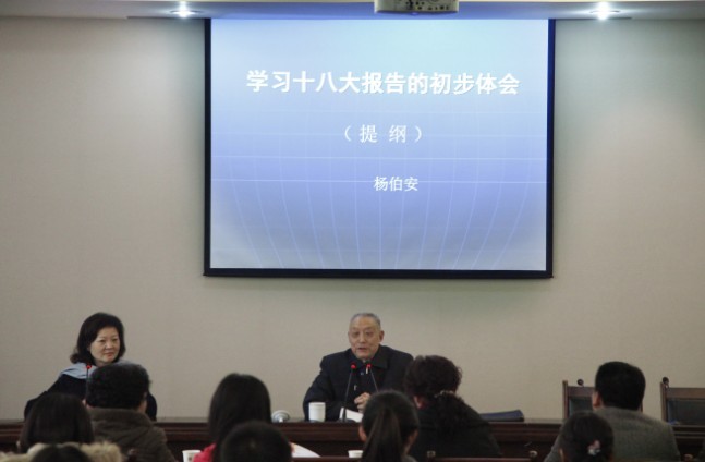 报告中,杨伯安教授结合自己的学习体会,从深刻领会党的十八大主题、过去十年的基本总结和科学发展观的历史地位、坚持和发展中国特色社会主义、全面建成小康社会的目标和布局、全面提高党的建设科学化水平、高校学习贯彻好党的十八大精神等多个方面对党的十八大精神作了精彩宣讲。结合十八大报告具体内容,联系高校建设改革发展实际,杨伯安教授认为,教育工作者要牢固树立“办好人民满意的教育”的信念,把立德树人作为教育的根本任务,着力培养德智体美全面发展的社会主义建设者和接班人;要全面实施素质教育,深化教育教学改革,提高人才培养质量,培养学生创新精神;要深化内涵发展,强化专业学科和教师队伍建设。