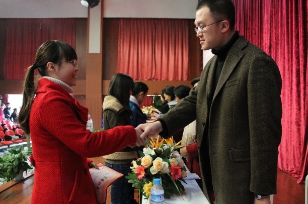 二校区党总支书记骆云英宣读《关于2011-2012学年度奖学金及荣誉称号获得者的决定》。并由在座领导为受表彰的二校区奖学金暨荣誉称号者颁奖。获奖者代表――2011级广播电视编导本科专业学生宫维静发言。(记者:刘旭 李良霞)