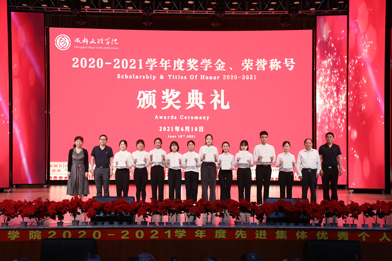 喻洪麟宣读《成都文理学院关于表彰2020至2021学年度奖学金、荣誉称号的决定》。她表示,在2020-2021学年中,全校同学按照德智体美劳全面发展的要求,进一步明确学习目的,刻苦钻研,努力提高自身素质;广大教师认真落实立德树人根本任务,切实履行岗位职责,涌现出一批先进集体和优秀个人。她希望,获奖个人要戒骄戒躁,进一步严格要求,争取更大进步。全校师生要以获奖同学为榜样,认真学习,勤奋工作,求实创新,为把文理学院建设成为以全人教育为鲜明特色的现代化应用型大学而努力奋斗。