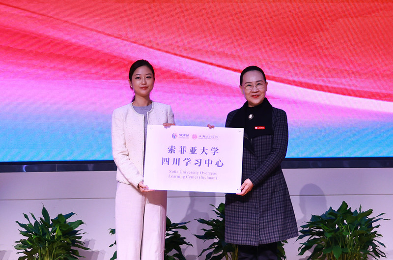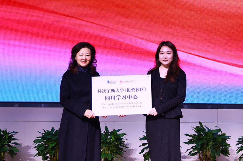 索菲亚大学协理副校长王雅俐为成都文理学院授牌,成都文理学院校长喻洪麟接牌;英国朴次茅斯大学(伦敦区)招生官(中国代表)宛晓青为成文理学院授牌,成都文理学院党委书记、政府督导专员高华锦接牌。